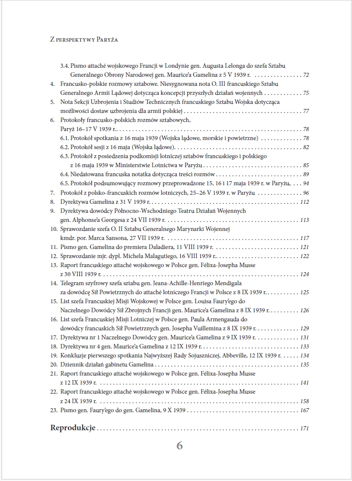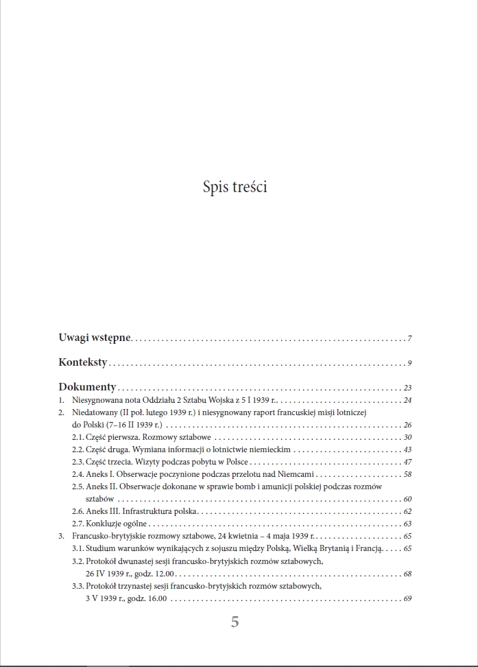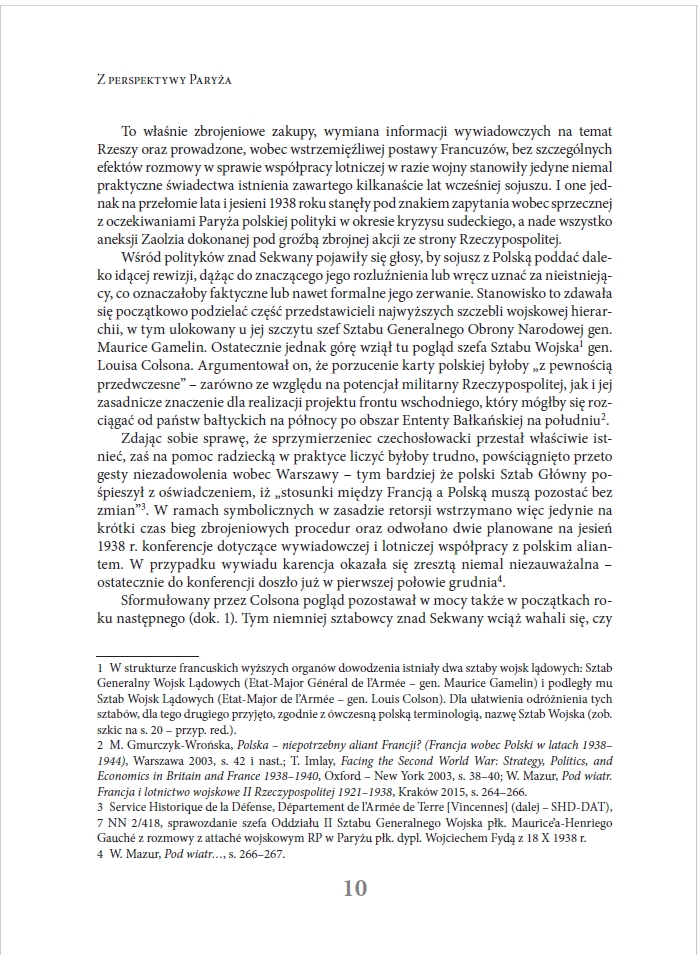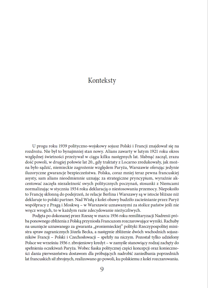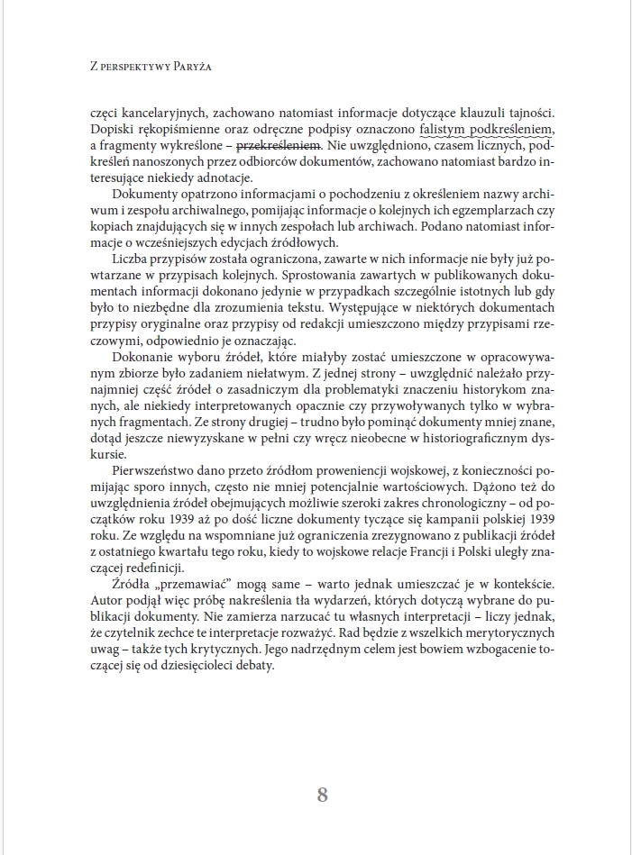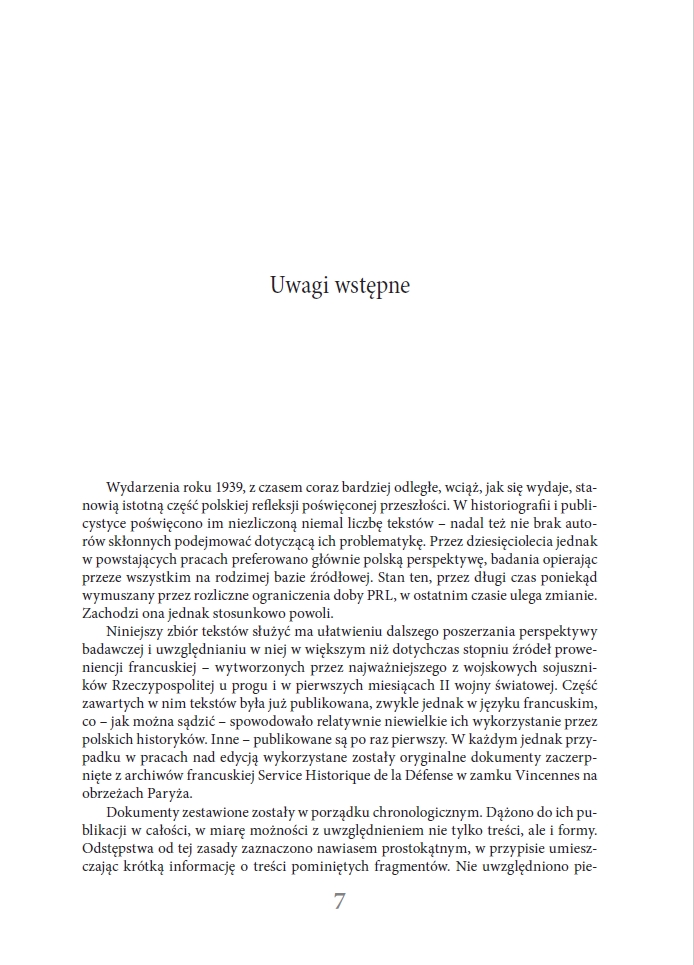 Zachodzi ona jednak stosunkowo powoli. Niniejszy zbiór tekstów służyć ma ułatwieniu dalszego poszerzania perspektywy badawczej i uwzględnianiu w niej w większym niż dotychczas stopniu źródeł proweniencji francuskiej – wytworzonych przez najważniejszego z wojskowych sojuszników Rzeczypospolitej u progu i w pierwszych miesiącach II wojny światowej. Część zawartych w nim tekstów była już publikowana, zwykle jednak w języku francuskim, co – jak można sądzić – spowodowało relatywnie niewielkie ich wykorzystanie przez polskich historyków. Inne – publikowane są po raz pierwszy. W każdym jednak przypadku w pracach nad edycją wykorzystane zostały oryginalne dokumenty zaczerpnięte z archiwów francuskiej Service Historique de la Défense w zamku Vincennes na obrzeżach Paryża. Źródła „przemawiać” mogą same – warto jednak umieszczać je w kontekście. Autor podjął więc próbę nakreślenia tła wydarzeń, których dotyczą wybrane do publikacji dokumenty. Nie zamierza narzucać tu własnych interpretacji – liczy jednak, że czytelnik zechce te interpretacje rozważyć. Rad będzie z wszelkich merytorycznych uwag – także tych krytycznych. Jego nadrzędnym celem jest bowiem wzbogacenie toczącej się od dziesięcioleci debaty.”